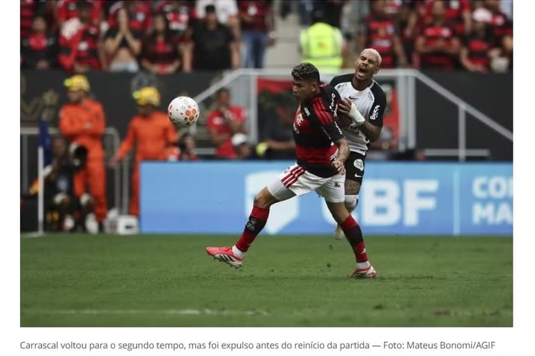 "A Confederação Brasileira de Futebol (CBF) esclarece que a expulsão do atleta Jorge Carrascal, na partida entre Flamengo e Corinthians, pela Supercopa Rei, ocorreu após checagem das imagens disponíveis, realizada pela equipe de VAR a partir do momento do lance, e que foi concluída quando os jogadores já haviam descido para o intervalo".