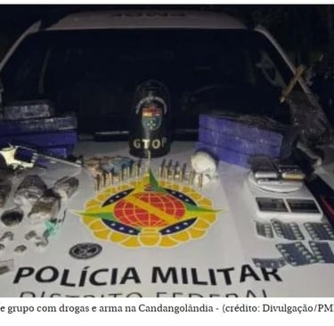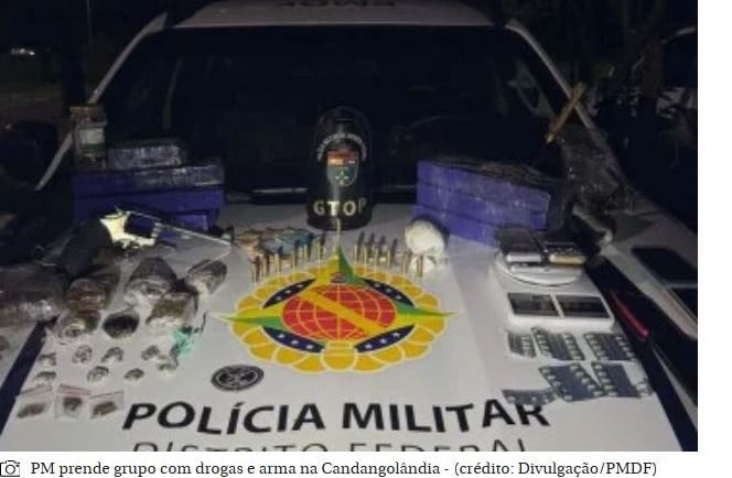 A Polícia Militar do Distrito Federal apreendeu dois adolescentes e prendeu dois adultos na noite desta terça-feira (13/1), na Candangolândia, durante uma operação do Grupo Tático Operacional (GTOP 21). com os presos foram encontrados drogas e arma de fogo. Segundo a PM, os menores foram apreendidos por ato infracional análogo aos crimes de tráfico de drogas e porte ilegal de arma de fogo de uso restrito. Uma mulher foi detida por receptação culposa. A ocorrência foi registrada por volta das 18h50, na QR 4, conjunto A.